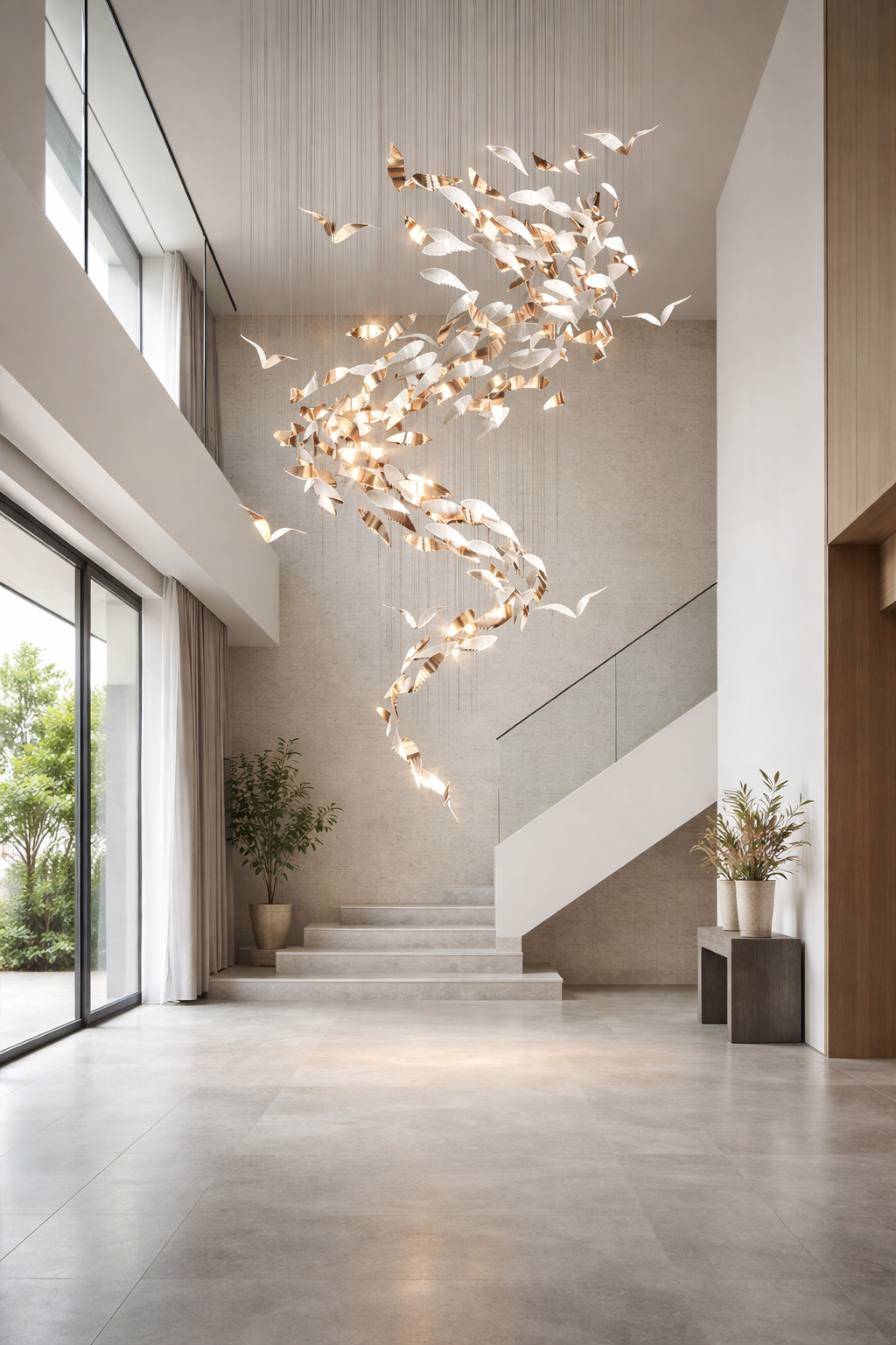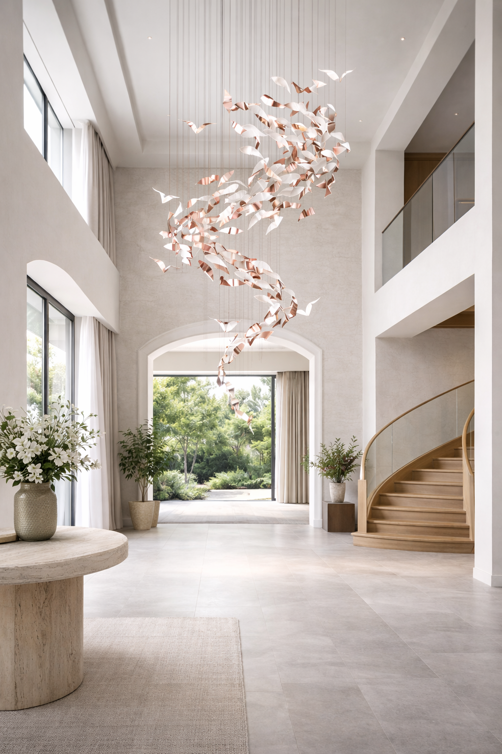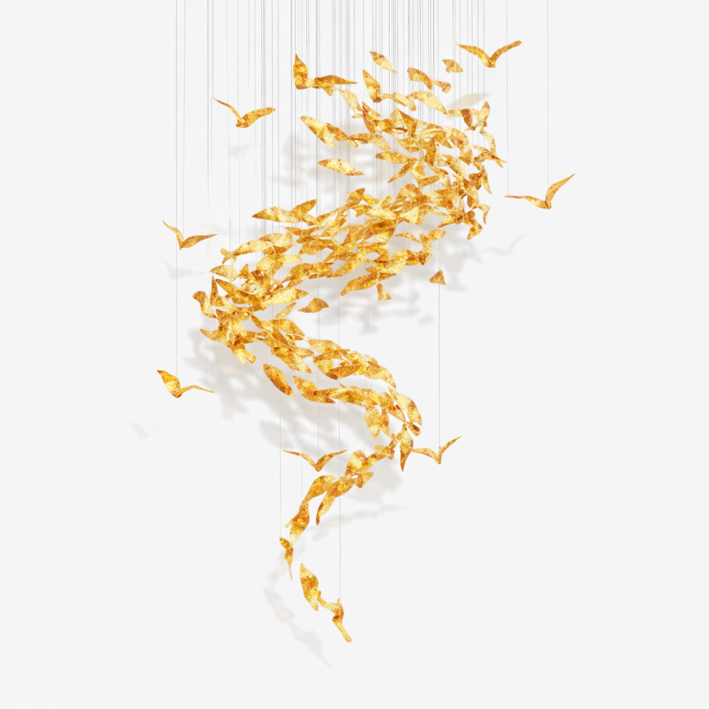 Its sculptural design makes it a striking centerpiece for staircases, high-ceiling living rooms, and grand entryways. The chandelier transforms tall interiors into architectural focal points while maintaining a sense of lightness and sophistication.